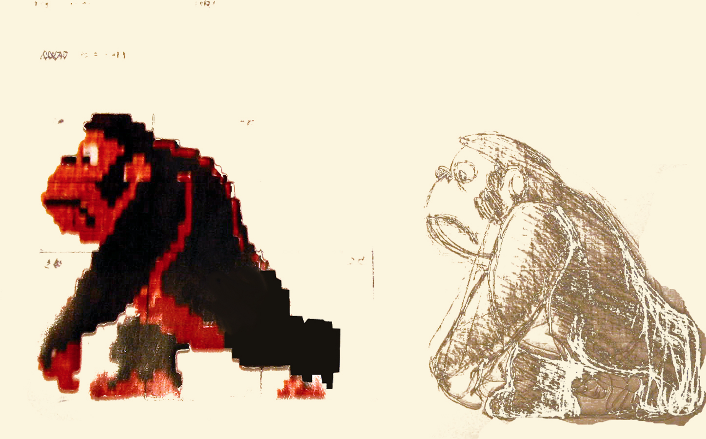 As you can see in this image (concept art for Donkey Kong ) the artists who made Donkey Kong tried to base it of a drawing that they drew of a gorilla and they have used pixel art to create it into a pixel formed Donkey Kong. They tried to base the main characters movements like a real gorilla like the way he looks and he walks is just like a gorilla only child friendly as it was a family game.